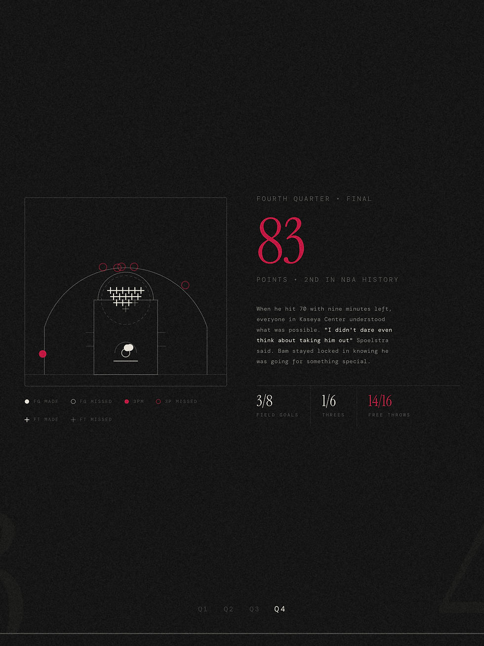BAM. 83. is a scroll-driven editorial experience commemorating Bam Adebayo’s historic 83-point game on March 10, 2026.