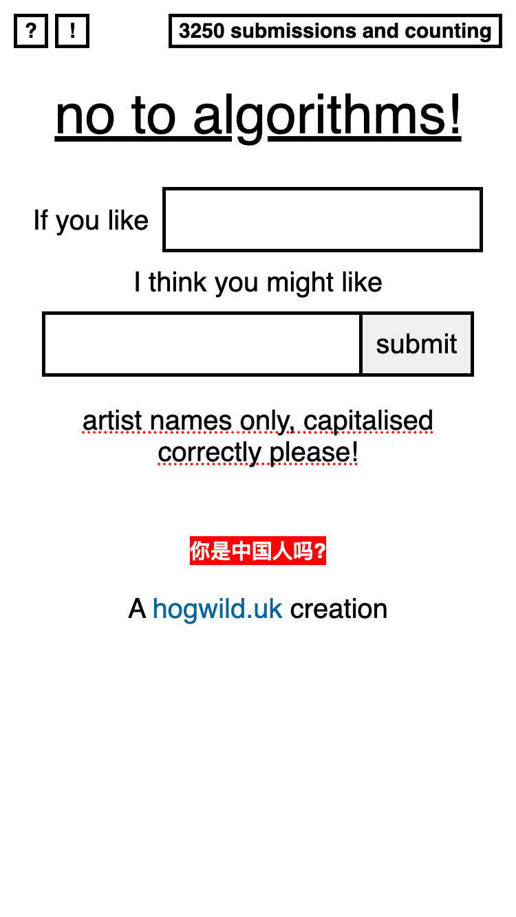 No to Algorithms! is a simple site to give and receive musical artist recommendations based on other artists you like.